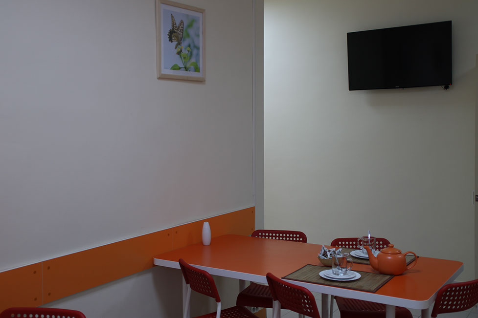Для отдыха гостям предоставлена светлая просторная обеденная зона с большим холодильником, микроволновой печью, электрическим чайником, необходимой посудой.